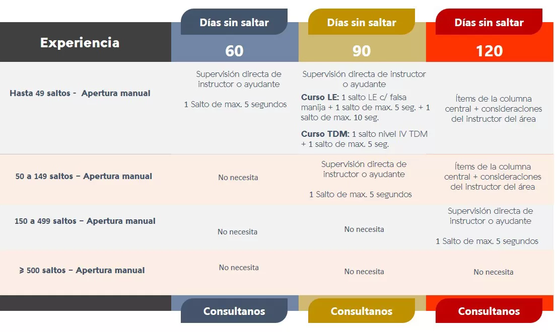 Antes de saltar, te brindamos formación en tierra acerca de los distintos aspectos del salto, donde te explicamos todo lo relacionado a seguridad y posición en caída libre. Los únicos requisitos para hacer el salto son ser mayor de 16 años, no pesar más de 90 kilos y gozar de buena salud general.